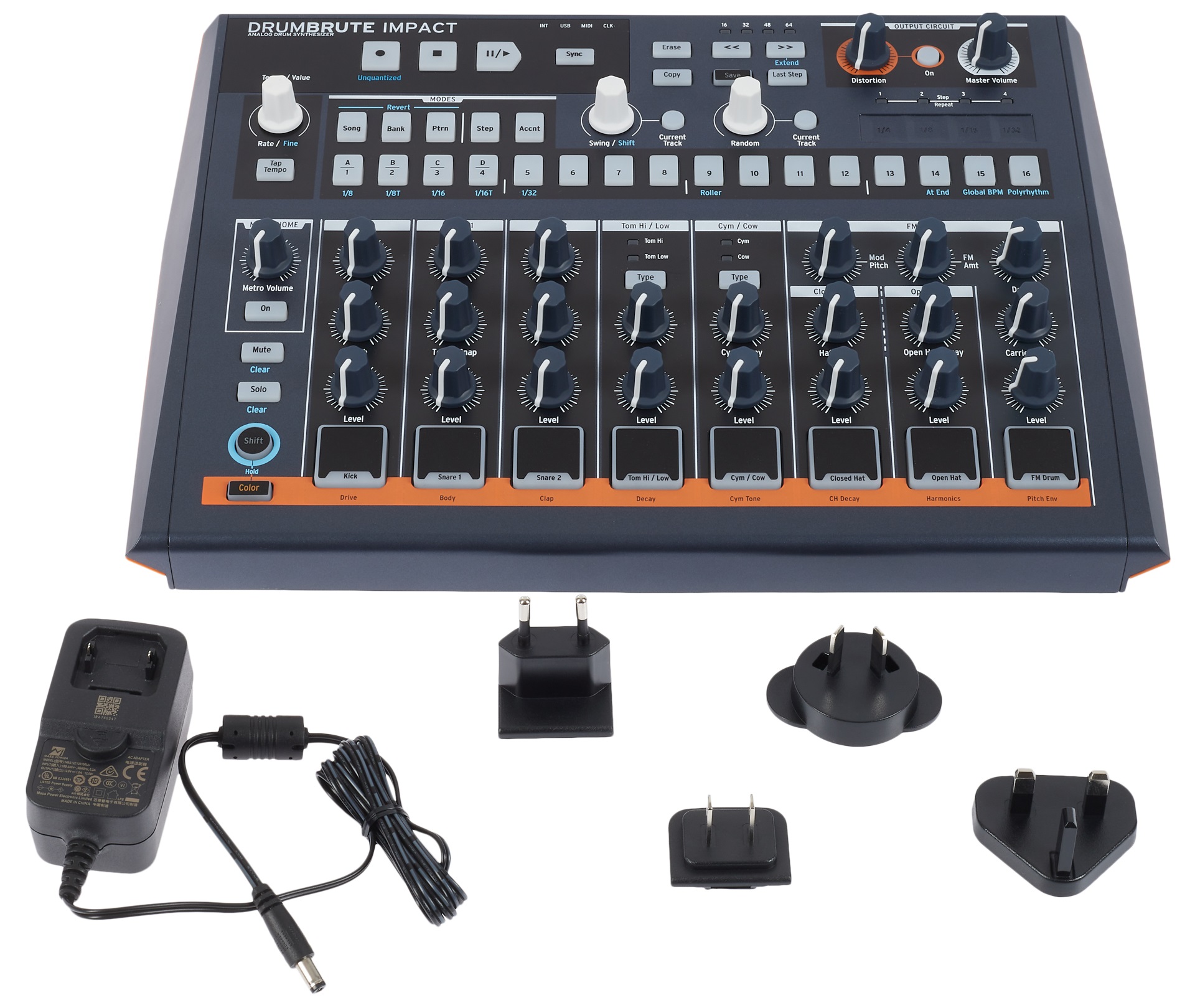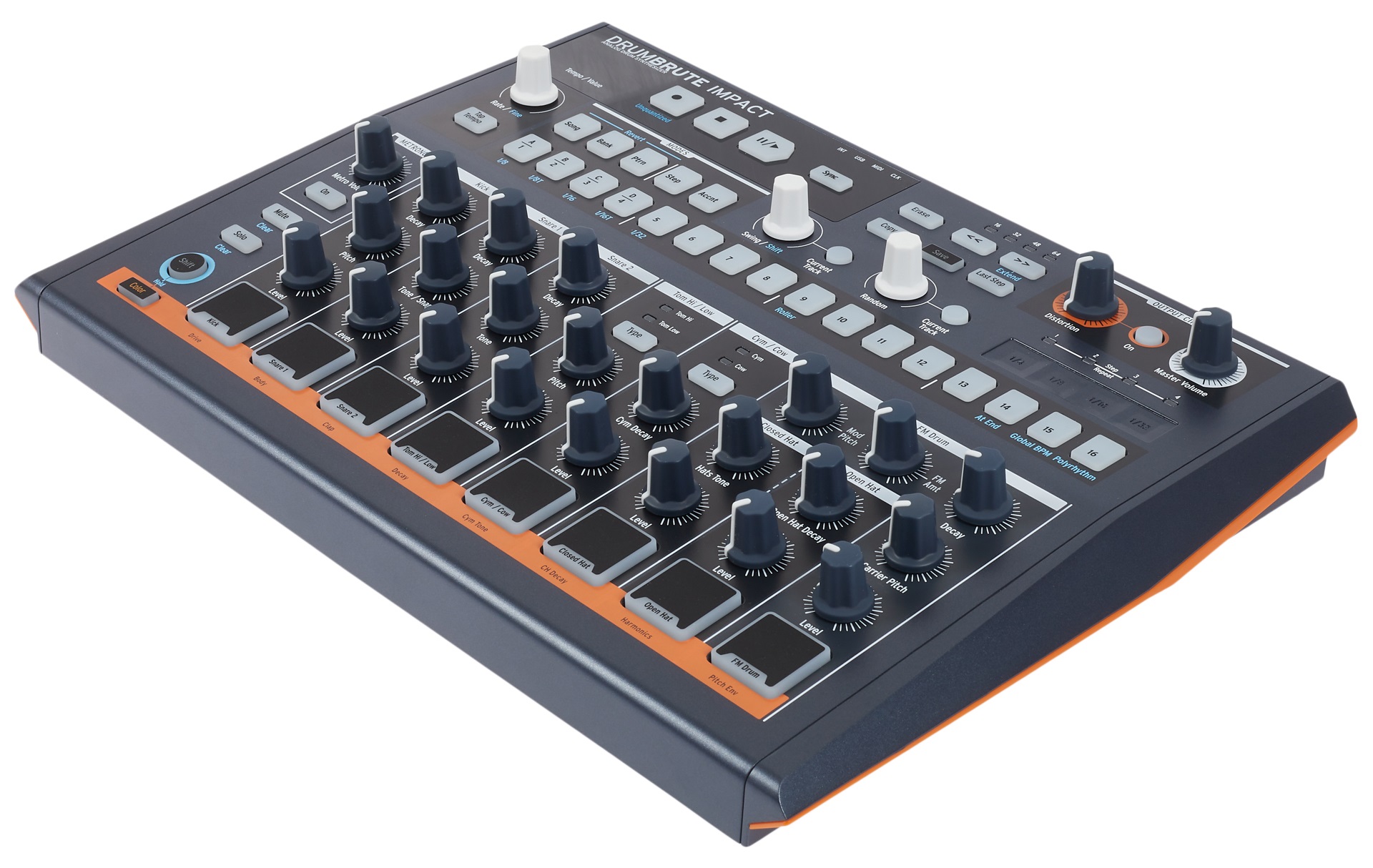 Analogový groovebox Arturia DrumBrute Impact navazuje na úspěšný DrumBrute a v novém kabátku je návykově zábavný, přičemž si zachovává veškerý potenciál a skvělý zvuk svého předchůdce. Arturia DrumBrute Impact obsahuje 10 různých zvuků bicích nástrojů. Kick, dva snare, vysoký tom/nízký tom, činel/cowbell, uzavřená hi-hat, otevřená hi-hat a FM perkuse. Tomy sdílejí stejnou řadu v rámci sekvenceru a mezi vysokým a nízkým tomem můžete volit stiskem tlačítka – totéž platí pro zvuky činelu a cow