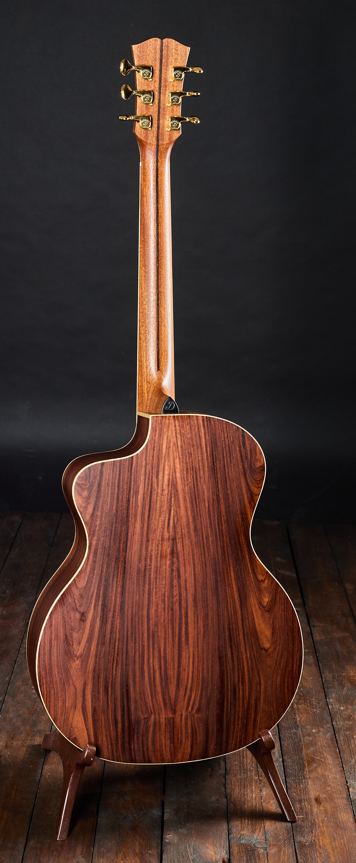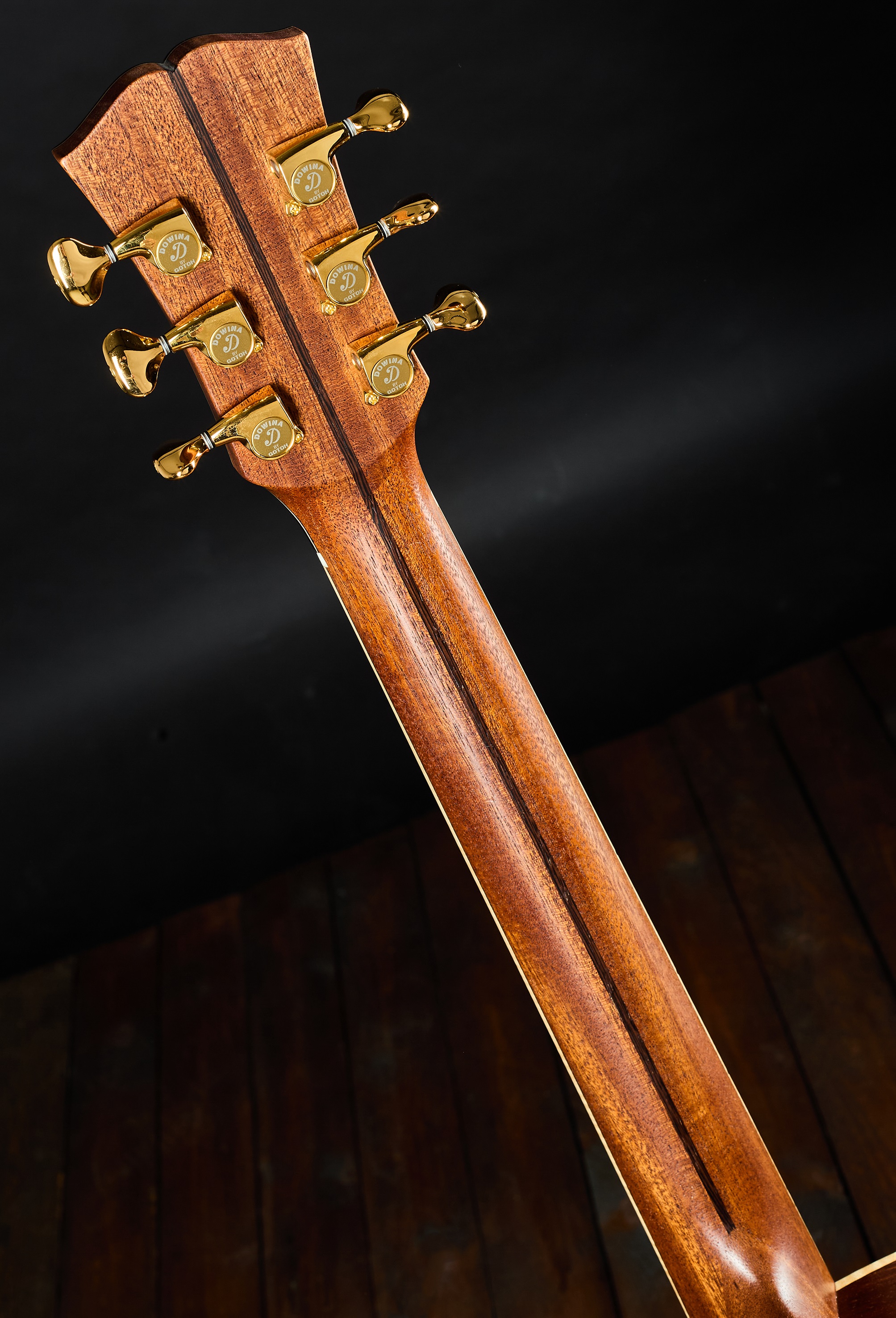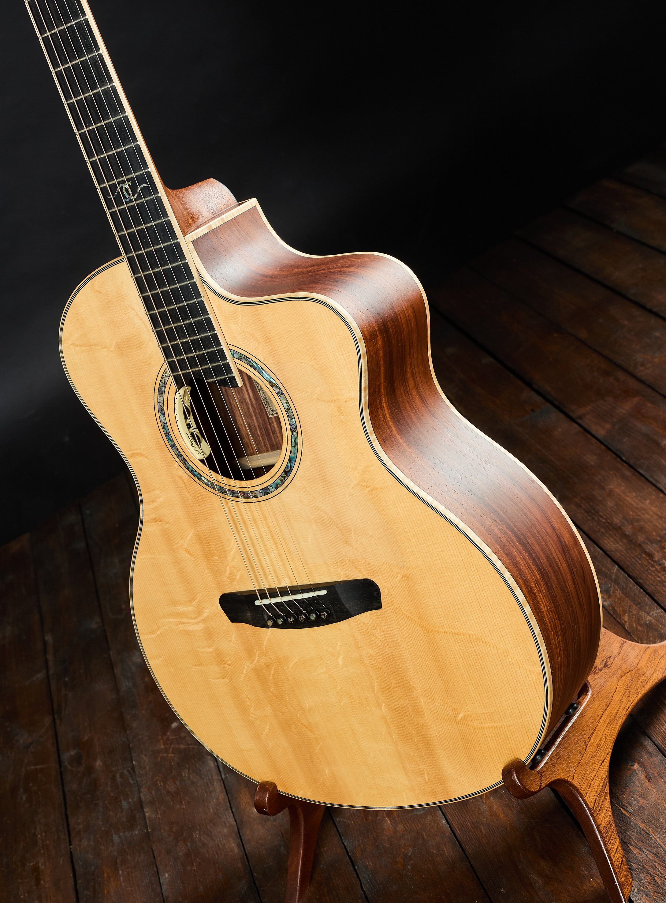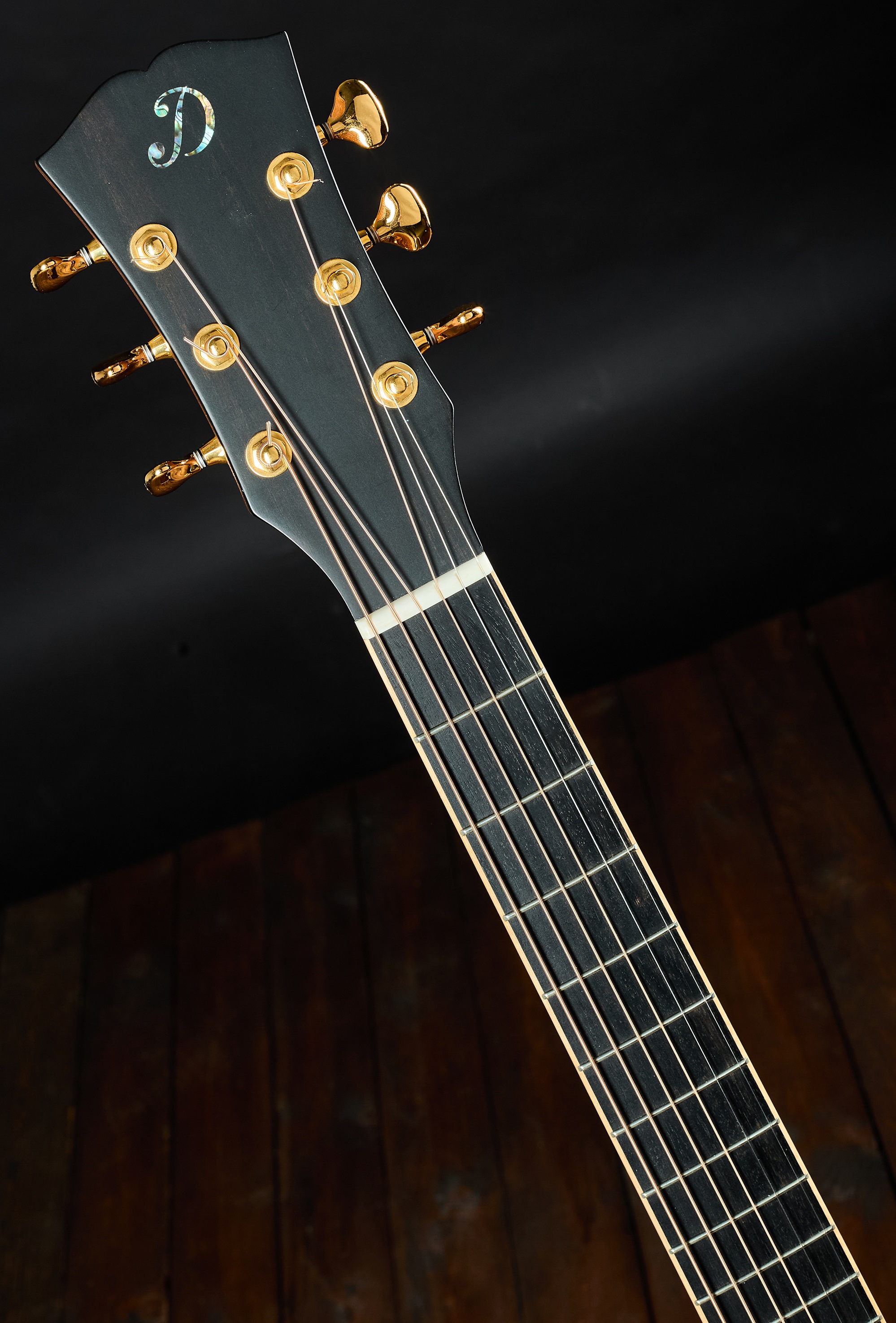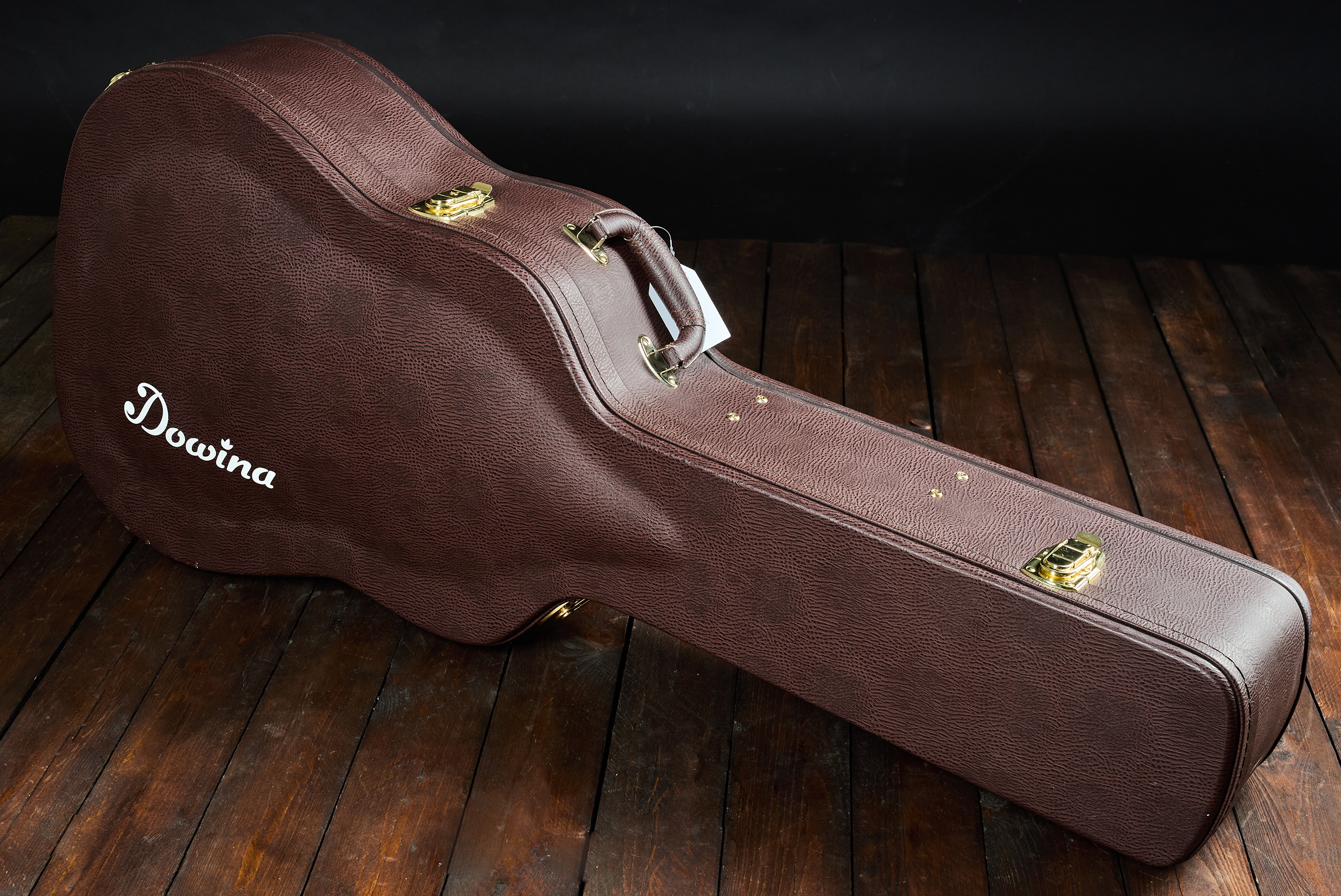 Elektroakustická kytara Mistrovská série od slovenské značky Dowina, ručně vyráběný celomasivní nástroj. Kytara z roku 2018 je v perfektním stavu, málo hraná. Tvar těla Grand Auditorium. Solidní podání nízkých i středových frekvencí, vynikající pro prstovou techniku i trsátko; zkrátka univerzální nástroj pro všechny příležitosti. Výřez pomáhá snadnému přístupu do vyšších poloh. Přední deska smrk s fládrováním „bear claw“. Zadní deska je ze 2 kusů cocobola (běžné provedení bývá pro vzácnost tohoto materiálu